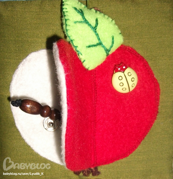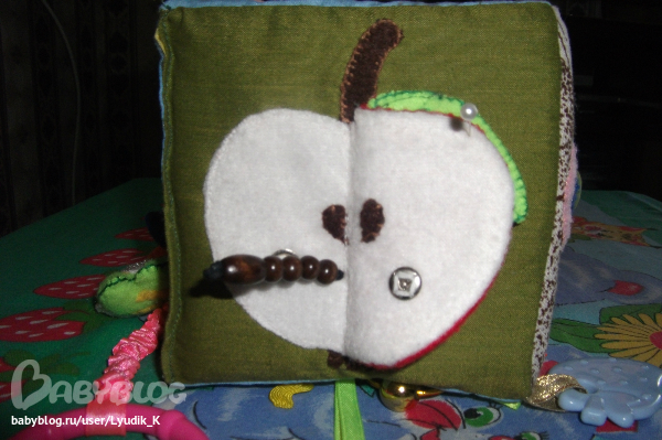 На четвертой грани Яблоко...долька яблока застегивается на кнопку,внутри гусеница из бусенок