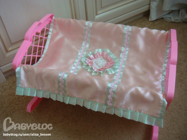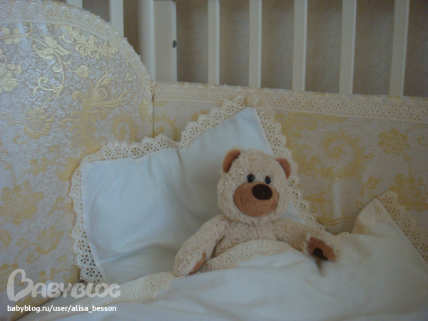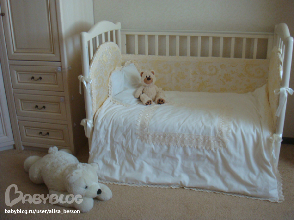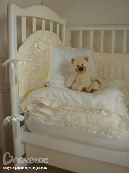 1. Комплект в кроватку для дочки: белье из хлопка с кружевом, простынь на резинке, бортики из парчи на молниях, поролон вынимается, 3 бортика сшиты в один. Хочу еще украсить вышивкой из лент и сделать покрывало. Долго стояла кроватка без дела, но после завершения гв наконец-то Аня в ней спит))))