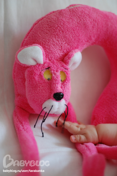Когда я похвалила ее подушки-игрушки, то она мне посоветовала сшить и Зое что-нибудь этакое. Но я подумала, что нам пока рано. Но увидела как у ребенка болтается голова в автокресле когда она спит и поняла, что подушка нам нужна!