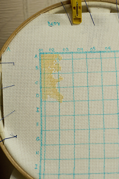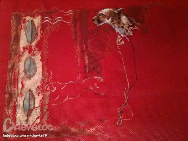 Усы вышила выкладной нитью, а не бэком, как по схеме. Вроде получилось более гладко, без урывков.