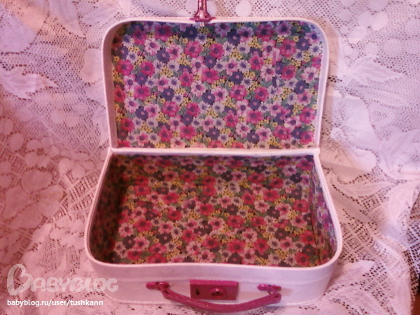 Ну вот ты и появилась. Внутри чемодан супер. А сверху конечно надо было фон доделать. Берешь белую краску подмешиваешь каплю коричневой- фон этот не сложный. А мне боюсь внутри слабо так сделать.