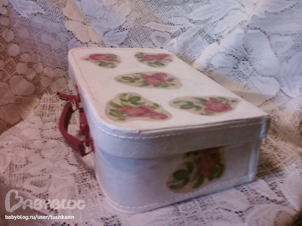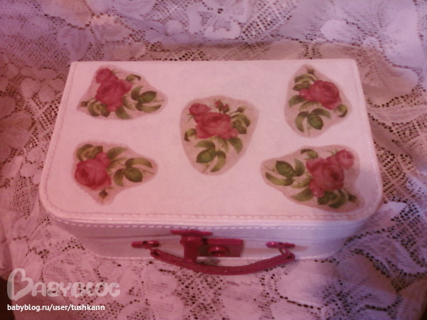 Спасибо))) просто хотелось сам чемоданчик сделать белым, а салфеток подходящих не было, вот и получилось как-то так))) а смотрится наяву лучше чем на фото, не получилось при дневном свете сфоткать(