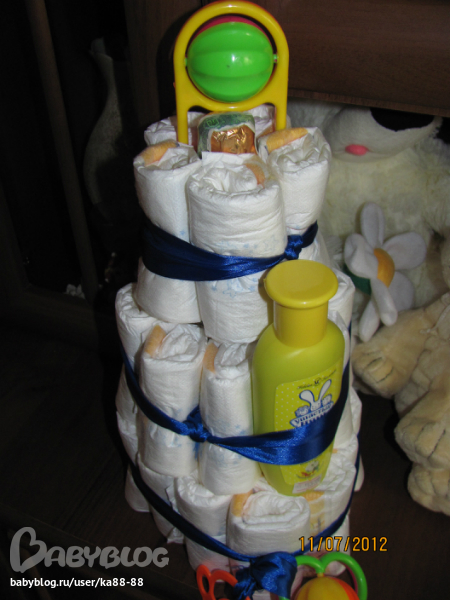 пулучился небольшой тортик,т.к. брала маленьку пачку памперсов 1.это мы идем вгости к новорожденному(его еще дома не будет,еще с мамой в роддоме).
