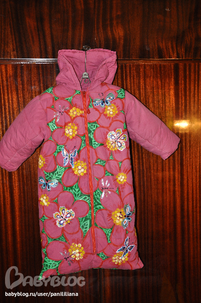 Нам достался детский мешок сшитый из старого китайского пуховика,очень тёплый, но выцвевший и я его раскрасила и потом не стыдно было гулять.
