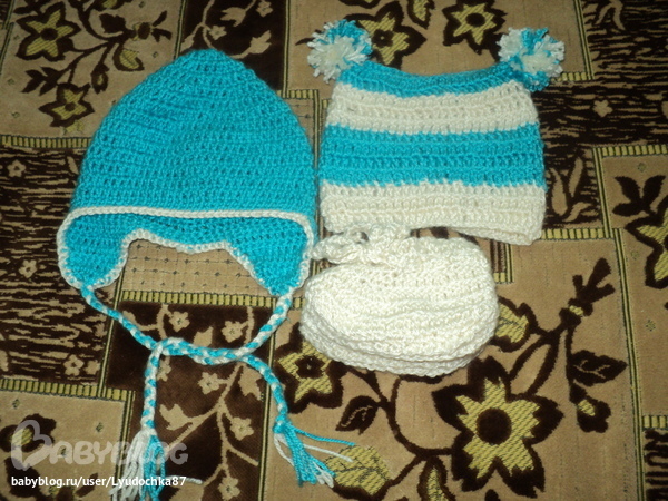 2 шапочки и пинетки, первый опыт вязания, можно расспустить на нитки, если кто так делает)))