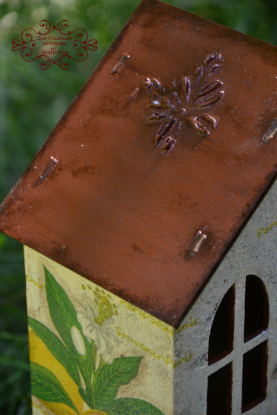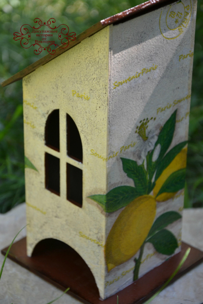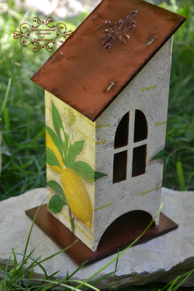 Даша (органайзеры для спиц и крючков на заказ) я делала кухонную доску с лимоном. Очень приятно, что подарок пришелся по душе, и Даша мечтала чаынй домик в комплект. Вот такой чайный домик родился: