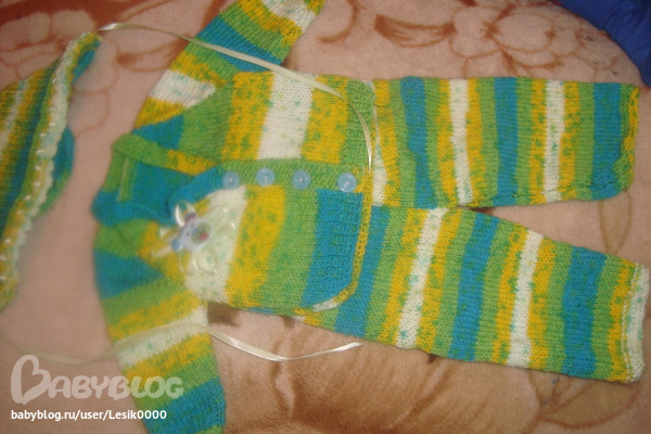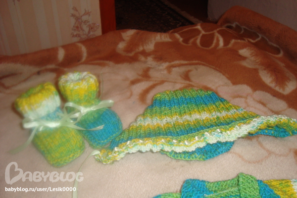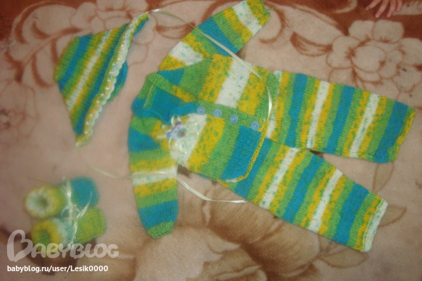 вот такой комплектик связался, пряжа Бамбино Беби, на три месяца примерно, смотря какой малыш.... украшен ленточками и небольшой апликацией... всё закуплено у прекрасного орга