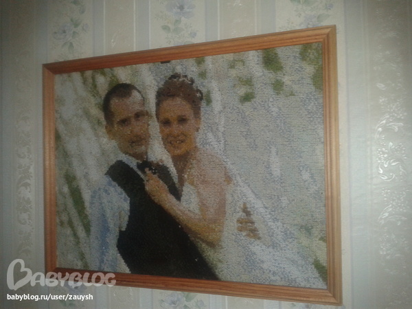 2.)наш свадебный портрет,вышивала в мае,вышила дней за 20,его я уже выкладывала сдесь,раскритиковали впух и прах,но это все же была первая работа такого плана!ошибки учла,теперь буду повнимательней выполнять схемы и брать больше цветов! но самое главное мне и мужу нравится этот вышитый портрет)))))))))))).работа 30 на 40.