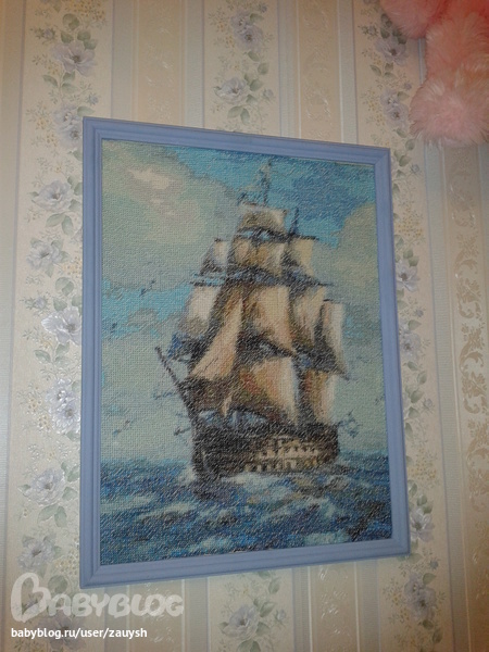 5.) и последняя моя работа,вышивала для мужа парусник,пока в таком оформлении. работа формата 30 на 40 шов полукрест!муж в восторге,да и мне нравится результат,да и вышился он феноменально быстро всего за 10 дней!