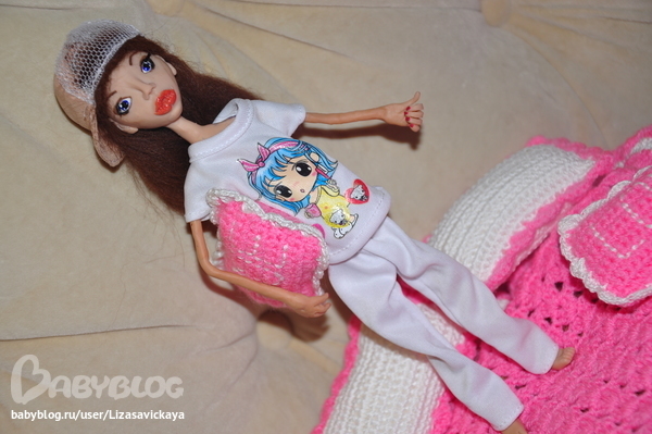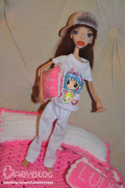 Она прекрасна))) ей бы еще повязку для сна для глаз)) Расскажите как Вы апликацию на футболку делали?