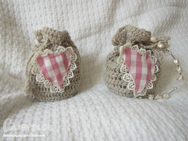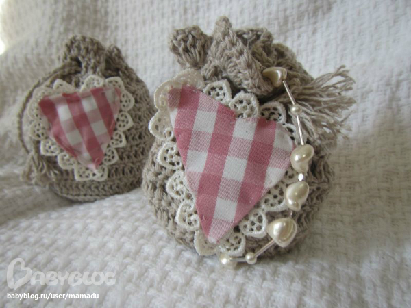 Конкретно у этих подкладки нет - чтобы были вентиляция, связано из льна, сердечко - хлопок 100%, кружево - хлопок 100%, веревочка - лен. Еще делала с саше, но они как бы ввязывалось вовнутрь и мешочек оставался мешочком. Можно сделать с хлопковой подкладкой. Будет чуть подороже. Тут именно нужна была вентиляция, так как лен обладает антисептическими свойствами.
