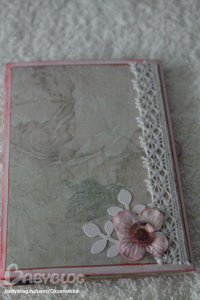 Обложка сделана из бумаги для визиток, тонирована дистресс чернилами розового цвета, использовала объемные наклейки, кружево, цветочки, полубусины, скрапбумагу, вощеный шнурок, надпись распечатана. Осталось купить прозрачную обложку и можно пользоваться!