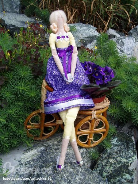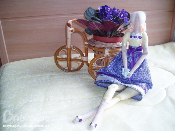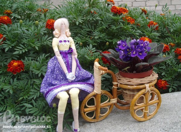 Велосипед с фиалкой - моя страсть! Кукла прекрасна! Прическа очень понравилась! А я не шила таких... Всё, иду шить Тильду!