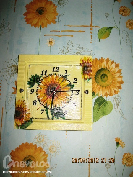 пришлось оторвать всё что на них было наклеено..убрала стекло..вклеила гофрированный картон..на него циферблат-распечатка..салфетка..подрисовка и новый часовой механизм.Лака 4 слоя.Сестра одобрила и уже повесила их на законное место.С выбором мотива всё было ясно сразу- подсолнухи там повсюду