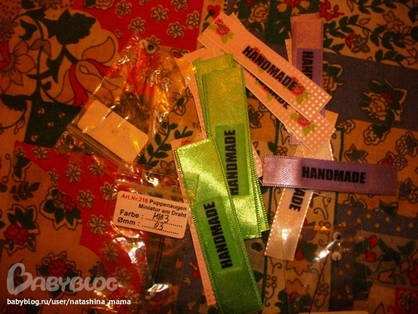 Совунья!!! Посмотрите, какие крохотные глазенки для моих будущих крошек! А еще там был замечательный сюрприз - вот такие ленточки-этикетки для моих рукоделок! Я в восторге! Юленька, про глазки мы обсудили, а вот этикеточки оказались совсем неожиданным и приятным подарком!! Я тебя обожаю!!!