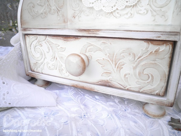 Татьяна, вы состарили его очень в меру и это придало объем вашим узорам. Насчет салфетки - она смущает только на фото, если прочитать описание что это комод с зеркалом, то все встает на свои места. Фотографировать зеркала крайне сложно, чтобы отражение было нормальным. Когда я фотографировала свой набор с лампой и зеркалом "белая королева" было двое помощников, прыгающих с тканью (для отражения) :-) вообщем Вы очень правильно сделали..