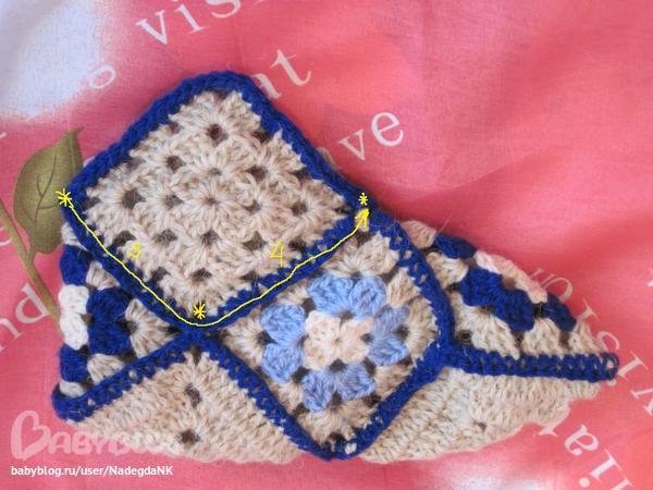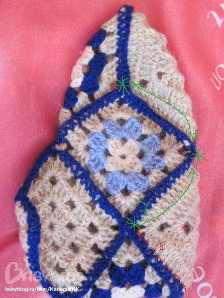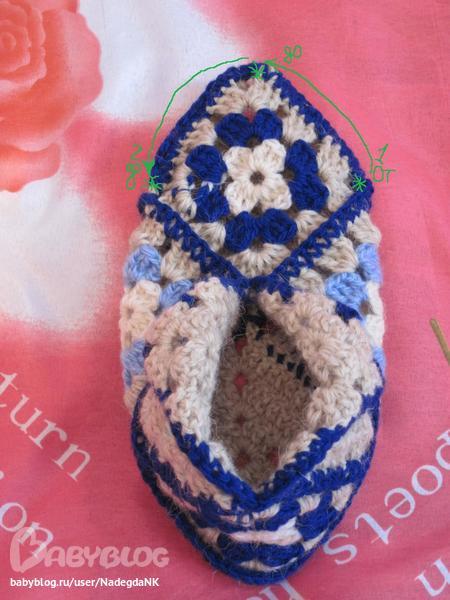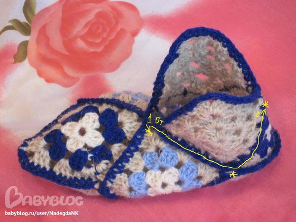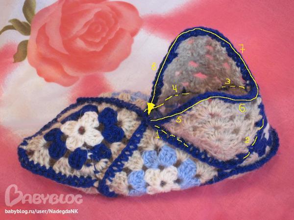 Вот следующий шов - присоединяем квадрат пятки - ведем крючок по зеленой стрелке. Не забываем, что нить мы не обрываем! Здесь цифрой 1 показано, что это нос тапочка - откуда мы начинали сборку.