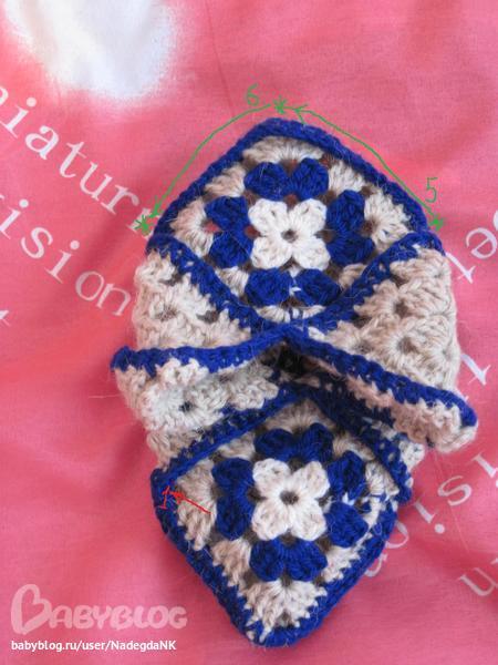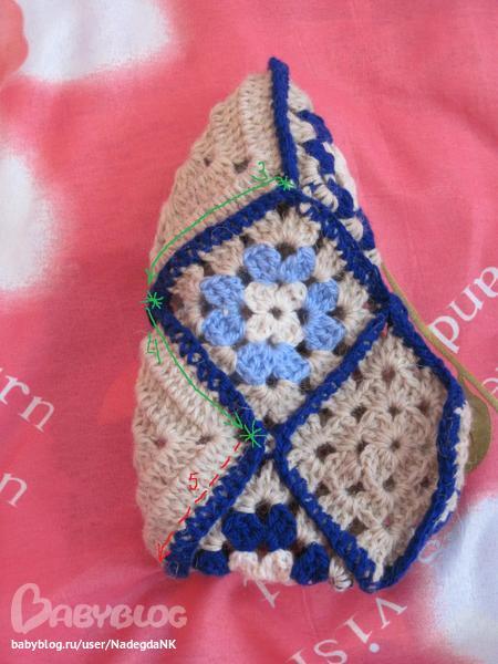 Начинаем собирать квадраты в тапочек. Крючком соединяем столбиками без накидов. От цифры 1 по зеленой стрелке соединяем верхний квадрат с квадратом для подошвы.