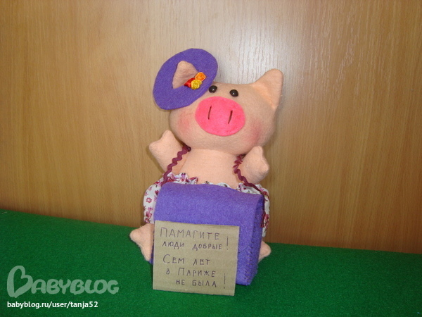 Игрушечный мир - животныеОдна молодая семья никак не может накопить денег на путешествие.Зарабатывают оба хорошо, а тратят, видимо, еще лучше, так что нужная сумма никак не находится. Я сшила для них эту симпатичную свинку ( символ богатства) с сумочкой, они будут туда денежки бросать, а вытаскивать - ни-ни, пока сумочка не наполнится. Договорились, что купюры меньше 100 грн (400руб) не бросать.