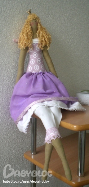 как и предыдушая куколка пошит из тильда тканей , верхняя юбочка батист собственного крашения :-),
