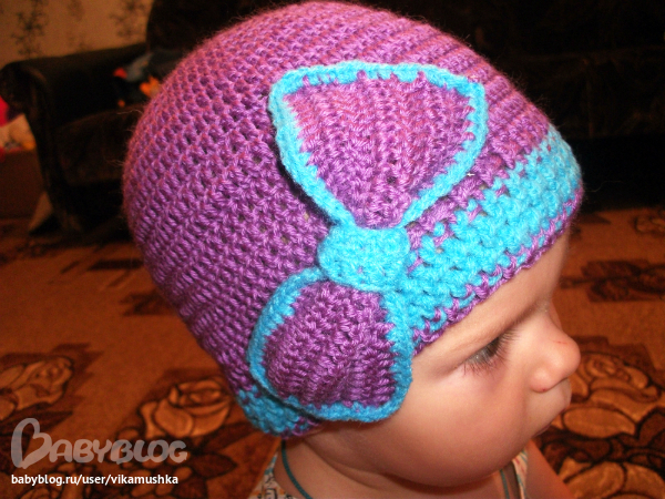 Схема шапочки простая.Я вязала 2-м способом 6 рядов.Потом просто вязала по кругу без прибавлений столбиками с накидом.А бантика схемы нет.Просто связала столбиками полосочку,обвязала голубым цветом и сшила посреди.