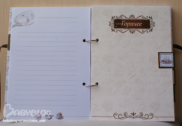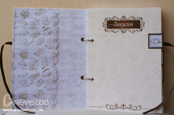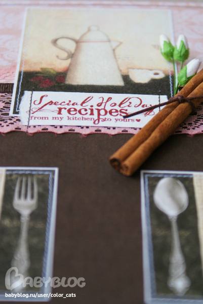 СкрапбукингНям-ням, какая книга получилась)))) Сделала просто так, захотелось попробовать что-то новенькое (кто видел мои предыдущие кулинарные книги, поймут меня). Внутри все как всегда. Формат А5, содержит четыре раздела: "Закуски", "Горячее", "Десерт" и "Разное". На форзацах два кармашка для хранения дополнительных вырезок, картинок, рецептиков))) Есть также таблица мер и весов. На обложке настоящая ароматная палочка корицы))))