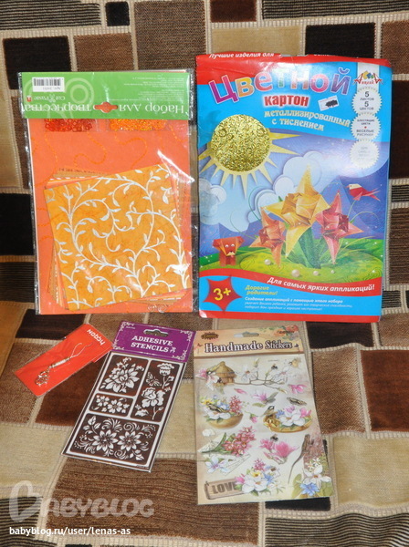 ну а это мне)))))картон,бумага(она классная,ручной работы,обажаю такую.....)подвесочка на сотовый,наклейки...в моей любимой теме,обалденные,а еще трафареты...Давно мечатала о таких или похожих...Юляш,спасибо тебе огроменнное))))))))я в восторге)))))))))))))))))