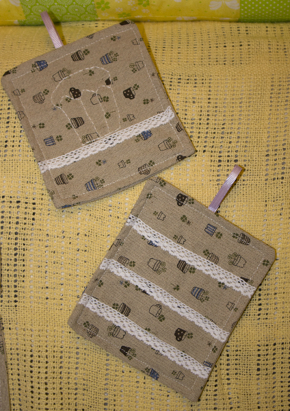 Декор, витражи.Мои получились попроще, чем мне хотелось (идея), не получается пока освоить аппликацию из ткани. Это больше украшение для кухни, чем практическая вещь, но для чая с подружками подойдет :) Шить "кирпичики" оказалось очень увлекательно, сделала 2 "домика" (себе в комлекте с прихватками, второй в подарок, на прихватки уже ткани не хватило). Детали проклеивала флизелином для жесткости. Осталось найти на кухне свободный гвоздик =)