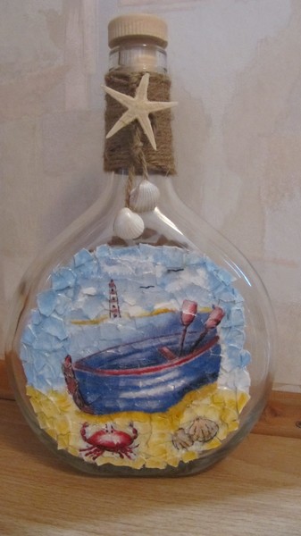 Еще выкладываю фото с пробным декупажем на яичной скорлупе...Та же "Морская тематика", только на стекле (бутылка из под коньяка)...