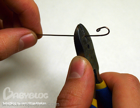Красивые работы )) Хотите совет? В первом издели сильно выделяются петельки проволоки в бутонах... можно загибать край проволоки не образуя крупную петельку. Примерно как на этом фото, только здесь крючок изготавливают.... Я, на самом деле, только краешек загибаю мм 3 и сильно прижимаю к пину. От спадания будет придерживать бисеринка. Надеюсь понятно объяснила )) Собираю таким образом грозди из страз Сваровски...