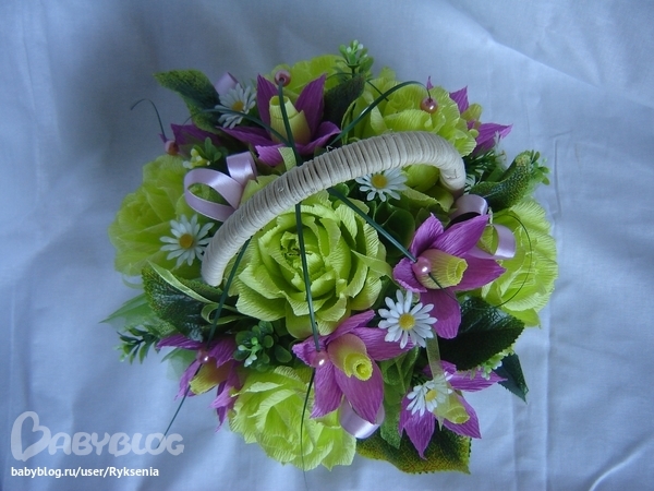 Всем привет! Девочки, скажу честно, во время отпуска я твердо решила не заниматься больше конфетно- букетным делом, материалы дорогие, сами знаете, а заказов у меня нет, как-то не получается с ними. Когда вернулась домой, зашла на сайт, насмотрелась ваших обалденных творений, и руки сами потянулись к бумаге и к т.д. и к т.п. И вот он)))