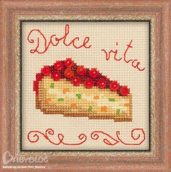 У меня дочка сейчас вышивает большую Дольче Виту. Бросала на период поступления в институт, сейчас взялась с новыми силами. Очень красивая и эффектная вышивка. В планах сделать и четыре маленькие. Размер рамки можно любой, там хороший запас канвы дан. Только надо будет делать глубокое паспарту или рамку - в наборе бусины и ленты.