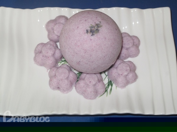 Здесь наполнителем магнезия. Добавляла гелевый краситель и растирала-растирала в соде... ЭМ апельсина и лаванды (заказали расслабляющую). Вмятины почти не видно.
