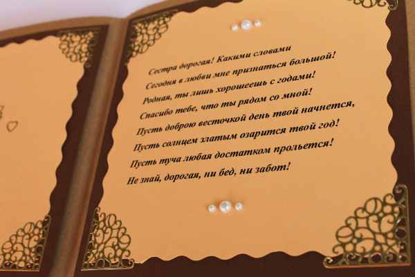 Она похожа на сладкую шоколадку!! Восхитительно! Я сама только пока мечтаю прикоснуться к скрапику и чего-нибудь вытворить....а вот до закупок дыроколов и бордюров еще не созрела...мечты...мечты!
