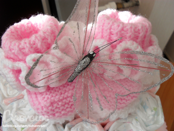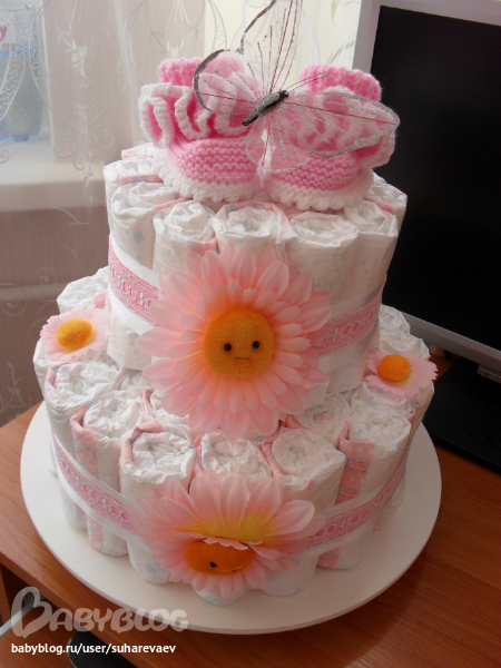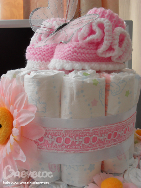ооочень классный! хотела в сентябре забацать что-то подобное подруге к рождению сыночка. пинетки уже есть. хотела спросить, сколько штук памперсов у Вас ушло на тортик, и какого размера.