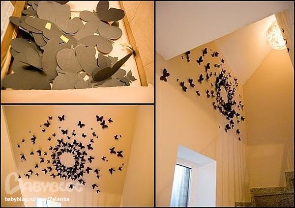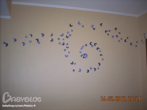 Наберите в поисковике "бабочки, дизайн" и смотрите картинки. Какая понравится, копируйте нужное кол-во раз и распечатывайте. Следов на стене после них не остается. А времени ушло не более 3,5 часов. Из них половину на выбор бабочки))