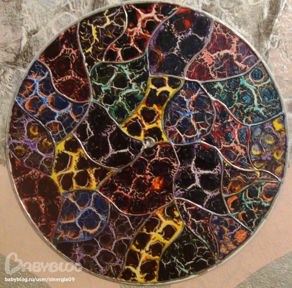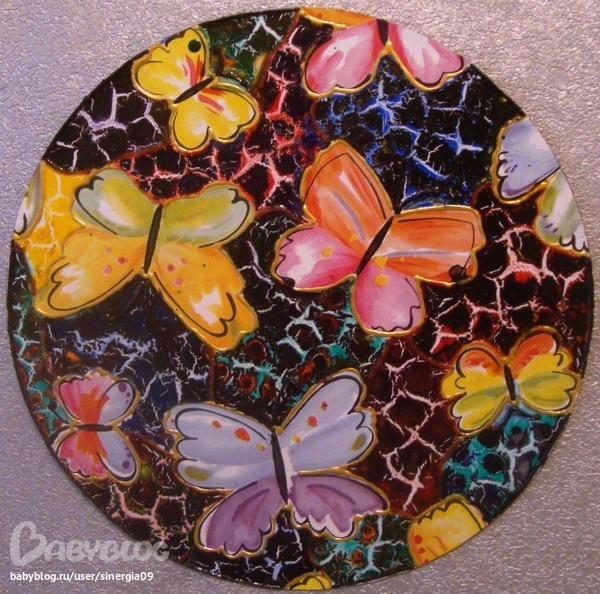 Пластинку в стиле мозаики сначала загрунтовала белой аэрозольной эмалью. Затем акриловым контуром разделила на сектора. Каждый сектор поочереди залила разведеным водой клеем ПВА. Тонкой кистю капала витражные краски (у меня фирмы DEKOLA). В середину каждой лужицы капала другой цвет (можно несколько цветов). Эффект кракелюра проявляется при полном высыхании (1-2 сутки).Ппластинка с бабочками оклеена пленкой "самоклейкой", где бабочки на белом фоне. Бабочки обвела контуром и далее по описанию.