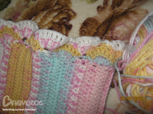 вяжу из бебиков(ниточки так называются)крючок 4,хоть и связано только ряда 4 но мне уже