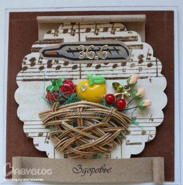 А эта сторона, самая долгопридумывательная для меня оказалась - здоровье, долго думала и отметала один за другим варианты того, что должно быть на этой стороне:) Потом придумалось вот так - смодельная плетеная корзинка и фрукты - ну как тут можно болеть?:))) еще и градусник 36 и 6 показывает:)))