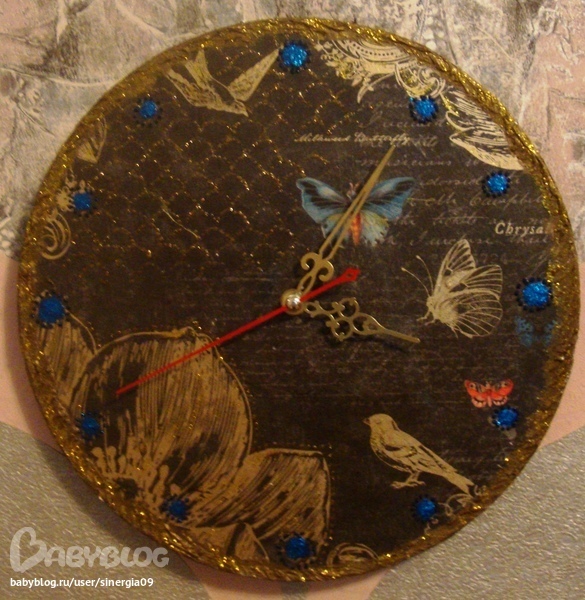 В основе старая виниловая пластинка, лист бумаги для скрапбукинга, "полубусины", текстурная паста и акриловые краски + стрелки с механизмом.