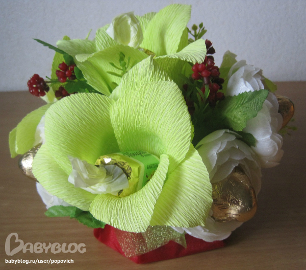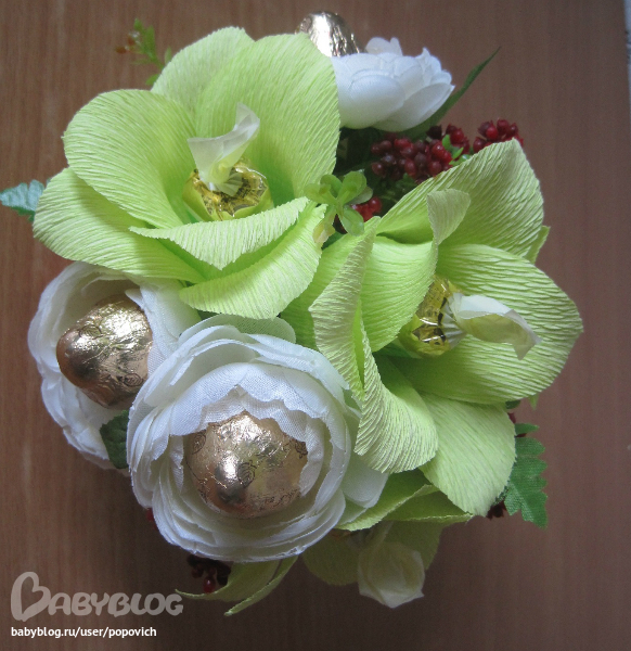 А лепестки из ткани самодельные?! Очень красиво! Туда бы Феррерку запихнуть, но и "Осенний вальс" отлично смотрится!!!