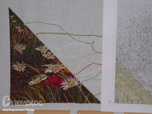 Похоже, что я первая со своим маленьким отчетиком. Почти не заметно, что я навышивала. Все трава,трава....Мелкий мне за выходные совсем не дал сесть за вышивку. Сейчас уложила и сяду вышивать....