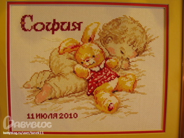 Очень оригинальное оформление! Тоже хочу своей крестнице вышить такую метрику, только на годик. Она как раз родилась в год кролика)) Не подскажите она продается в наборе или нужно подберать нитки?