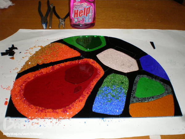 вот таки нашла разобранный витраж. здесь кусочки стекла прихвачены оловом, чтобы было удобней работать. очень важно, чтобы не было больших отверстий между кусочками стекла, нужно вырезать и подтачивать так, чтобы соприкасались идеально. ну или хотя бы почти идеально)) техника тиффани
