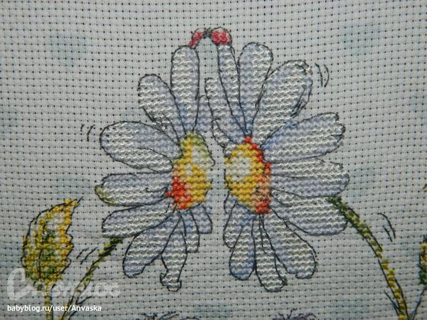 Ромашки, сердечки и кружочки на горшочках, как и указано в ключе, вышила сатиновыми нитками. С бэком пришлось немного повозиться, хотя обычно он мне легко дается,но здесь он меня изрядно помучал)))много детальных стежков в середину крестиков и в их боковинки. Зато результат меня очень порадовал, каждый день достаю и любуюсь))) Несколько фрагментов поближе:
