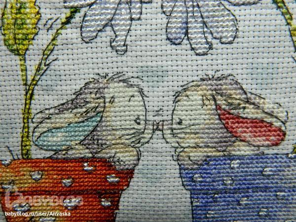 Давно мечтала вышить этих всем известных прелестных созданий, даже за канвой с голубыми сердечками пришлось немного поохотиться, собственно надежда на ее приобретение и была одним из стимулов моего посещения апрельской выставки "Magic Stitch", и эта надежда оправдалась (см. в дневнике). Вышивала зайчат в перерыве между своей крупной работой, в качестве передышки и отвлечения от приевшегося сюжета моих все еще ждущих своего звездного часа ирисов))