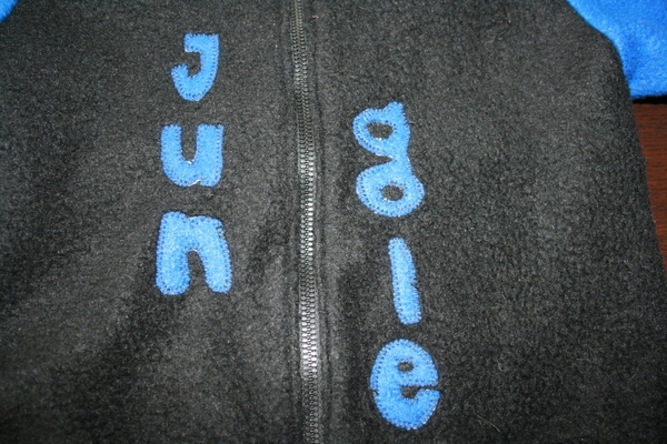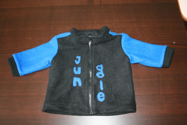Выкройка Оттобре, манжетики покупные, сложила вдвое, чтобы плотнее облегали ручку. В журнале на модели на спинке есть аппликация обезьянки, но я ее делать не стала, и без того с буквами намучалась.