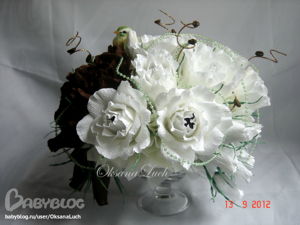 Композя на креманке. В этих тонах я делала дублер свадебного букета. Понравилось, решила что-то другое но тона те же. Тут у меня были мечты... кофе, сахар, сливки и суфле с фисташковой крошкой))) О как меня завернуло...