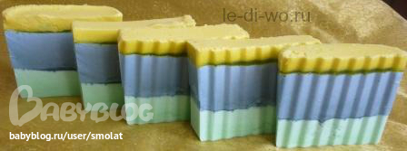 История такова - делаю в порте лица коробочки для тортика со взбитым кремом, а сына рядом, я на полу... Ну он взял кусок торта и его весь покорёжил... Сначала думала, сами будем мыться, потом думаю, ведь у нас с "нуля" полно... И решила переплавить и взбить... Вот что вышло! Подробнее....Масло миндаля, отдушка лесные ягоды - это розовых мыльцах, тех, что из тортика... А дальше не могла остановиться, и наделала под нарезку! Тут масло льна, облепиховая, голубая глина во 2 слое... Резала сначала нитью, потом не понравилось, стала резаком резать... Вот так вот сына заставил поэкспериментировать!