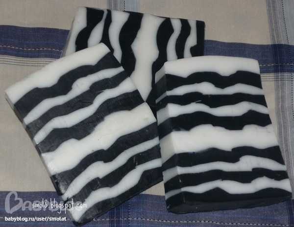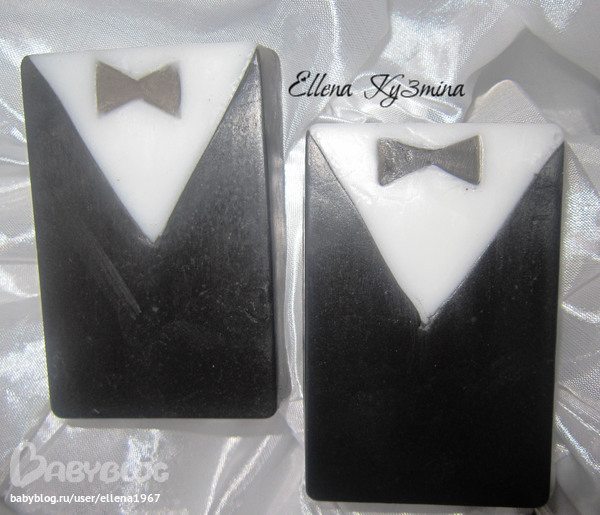 Я мужу делала такое:.белый-капелька+серебрянный перламут-вставка.и само мылко черное.......... по этой технологии